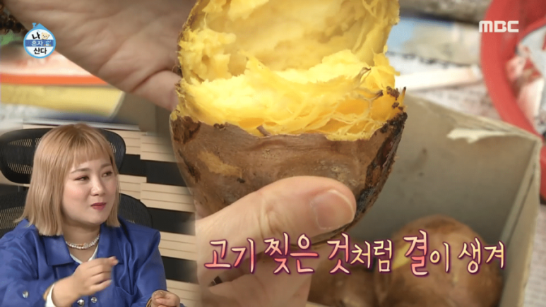 박나래는 "호박 고구마는 일단 껍질을 까는 게 아니라, 반으로 갈라야 한다. 그러면 고기 찢은 것처럼 결이 생기는데, 그걸 이로 뜯어야 된다"고 호박 고구마의 매력을 전했습니다.