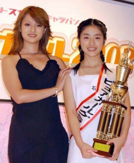 ▲2002년 센빠이 후카다 쿄코의 축하를 받으며 그랑프리를 수상한 사토미짱. 풋풋~~♪♪