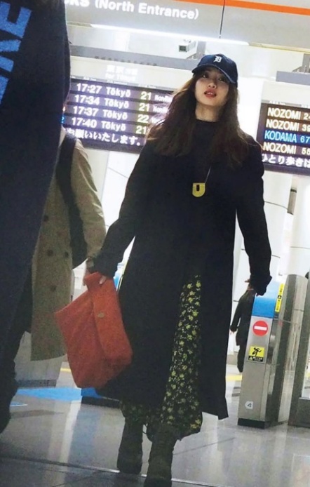 ▲오사카에 있는 USJ(유니버설 스튜디오 재팬)에서 신칸센으로 시나가와 역으로 돌아온 이시하라 사토미. 안심한 듯한 표정이 사랑스럽다(ホッとした表情がかわいらしい)(2019년)