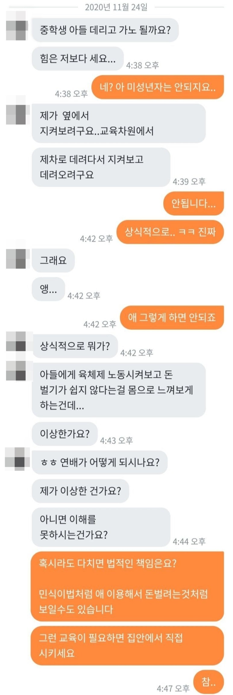 그러자 B씨는 "상식적으로 뭐가? 아들에게 육체적 노동시켜보고 돈 벌기가 쉽지 않다는 걸 느껴보게 하는 건데.. 제가 이상한 거냐 아니면 이해를 못 하시는 거냐"고 따졌습니다.