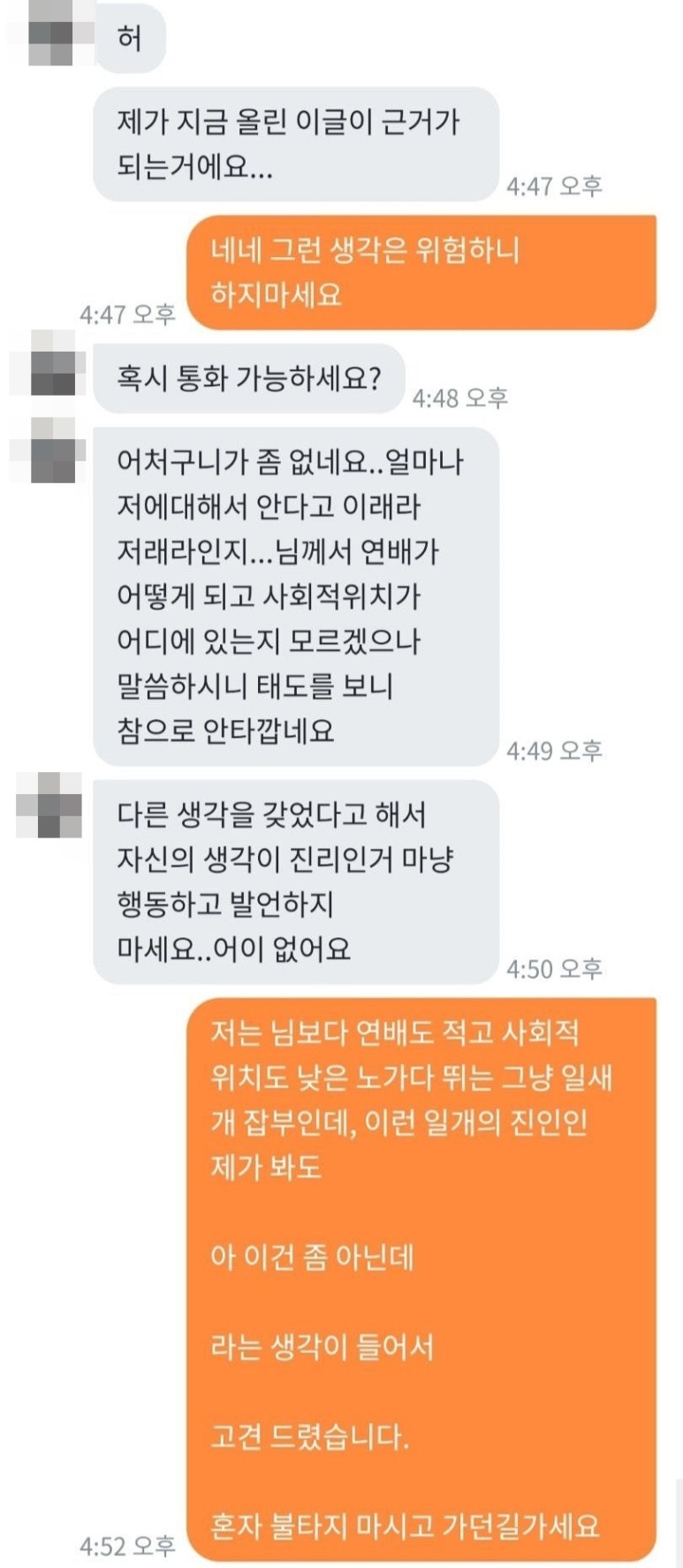 B씨는 "저에 대해 얼마나 안다고 이래라 저래라인지.. 님께서 연배가 어떻게 되고, 사회적 위칙 어디에 있는지 모르겠으나 말하는 태도를 보니 참으로 안타깝다"고 받아쳤습니다. 자신의 생각이 진리인 것처럼 말하고 행동하지 말라는 것.