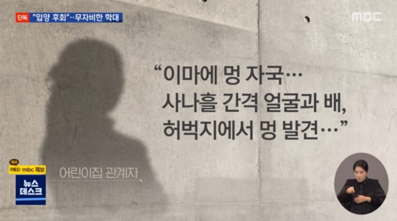 어린이집에 따르면 이마의 멍 자국을 시작으로 사나흘 간격으로 얼굴과 배, 허벅지에서 멍이 계속 발견됐다고 합니다. 7월부터는 엘리베이터에서 유모차를 세게 밀어 벽에 부딪히게 하거나, 손으로 아이 목을 잡아 올리는 등 폭행을 한 장면이 cctv에 포착됐습니다.